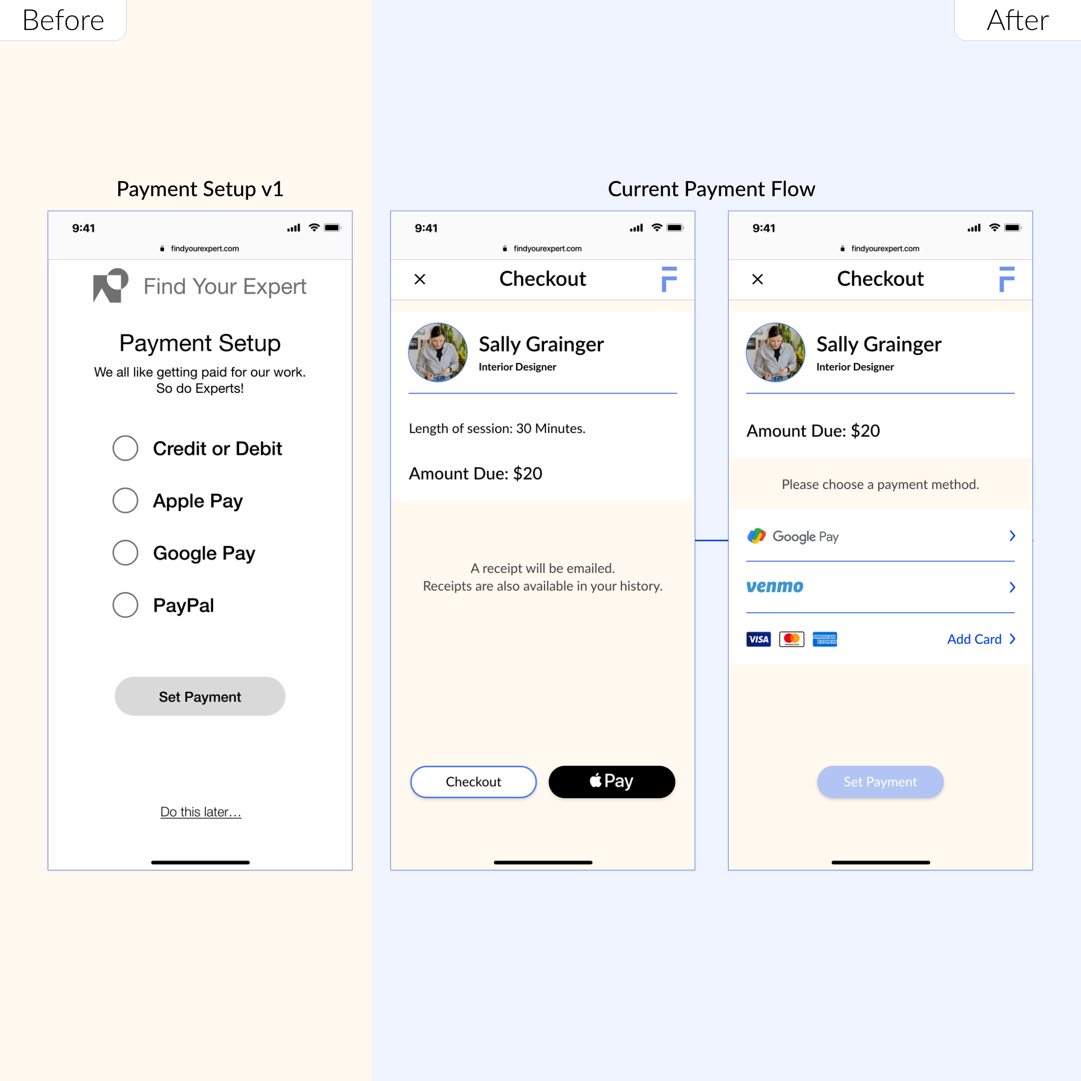 How might we address failed payment if the user backs out or and error in processing? Possible dashboard reminders to complete the payment. Users can continue to browse the site, but can't contact another expert before completing payment.